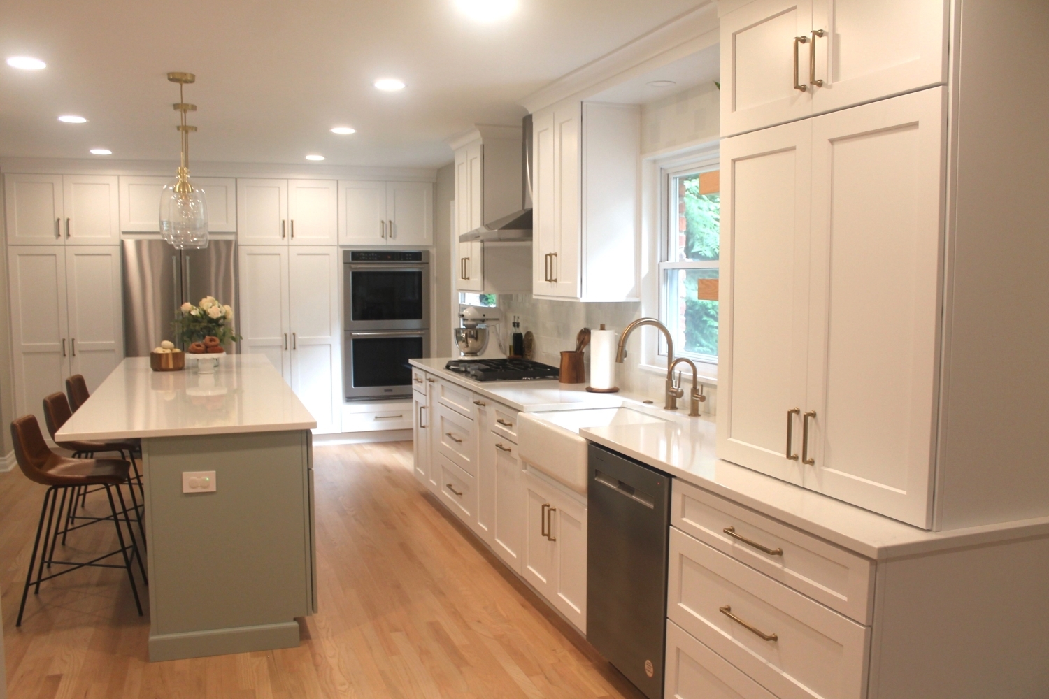 We were able to create this spacious kitchen for our clients by taking down the wall between the kitchen and dining room. The large island with seating is great for entertaining as well as countertop space for food prep. The pantry wall provides ample storage and a place to house the refrigerator and double ovens. We wanted to avoid crowding the main walkway through the kitchen from the front of the house to the family room, so we tucked in a coffee bar where a seating area or furniture would be too cumbersome. That way we could give our clients maximum functionality without obstructing the flow. Brass accents pair beautifully with the white and soft green cabinets.