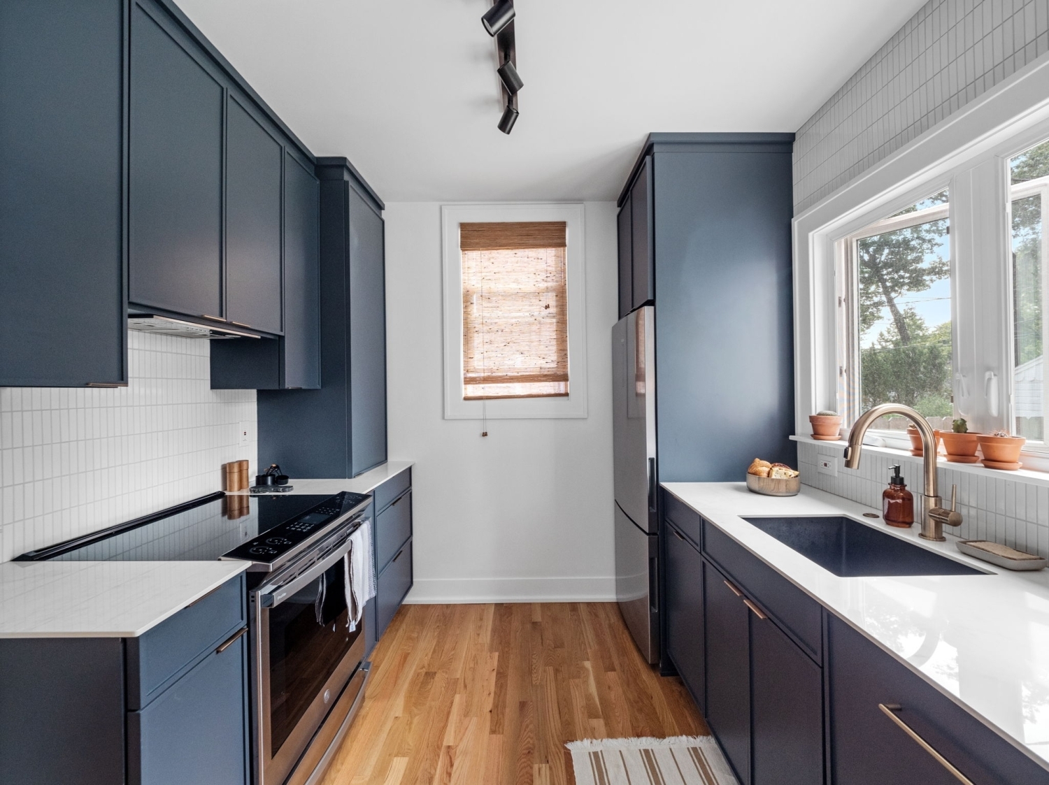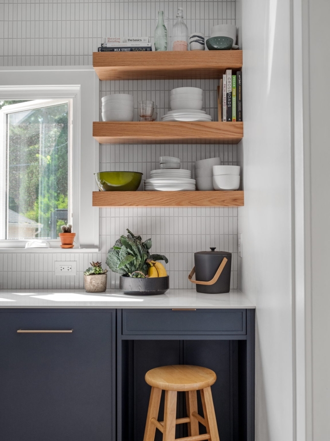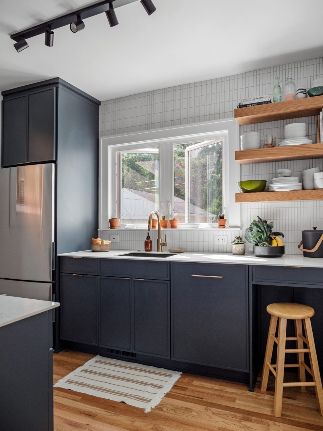 Small spaces require thoughtfulness, creativity, and design experience to ensure everything functions properly. The thin, clean lines of the slim shaker cabinets and porcelain countertops bring a stylish and modern touch to this kitchen. Linear, minimalistic hardware and backsplash tile elongate the space. The floating shelves, stained to match the natural wood floor, allow more natural light to pour into the kitchen. The hidden cabinet behind the bar stool and hidden storage in the cabinet sitting on the countertop provide extra storage while maintaining clean lines.