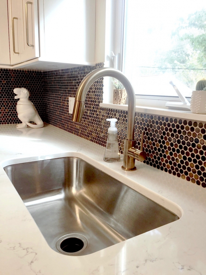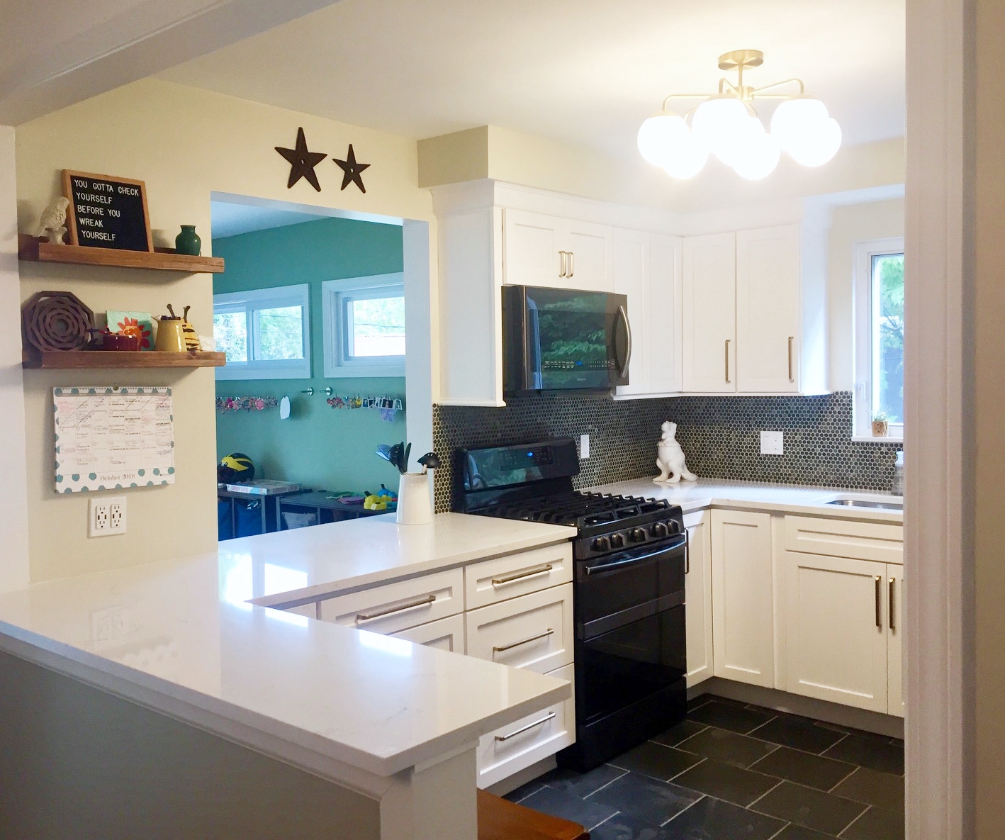 Prior to this beautiful kitchen with white shaker cabinets and dark slate floor and penny tiled backsplash, the kitchen had outdated laminate cabinets. We decided to install white with grey veining quartz tops and brushed bronze-gold hardware and faucet for modern touches of elegance
