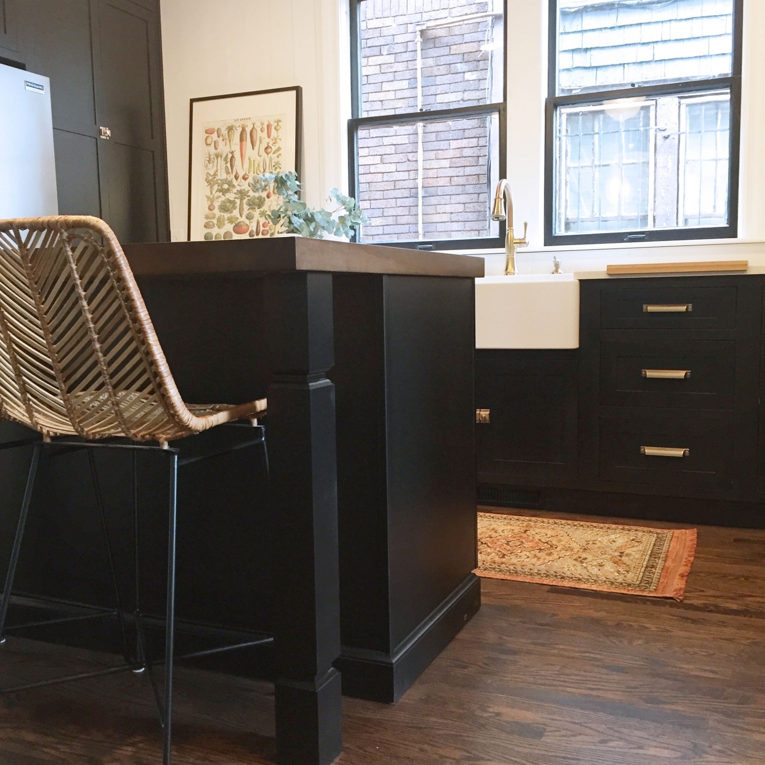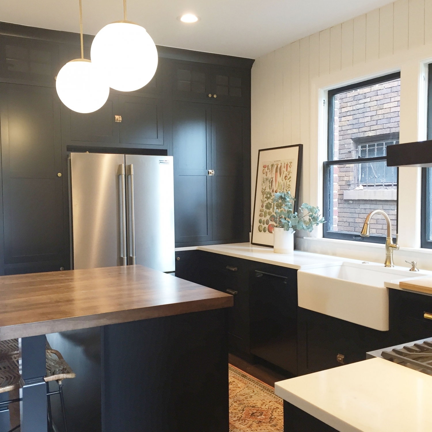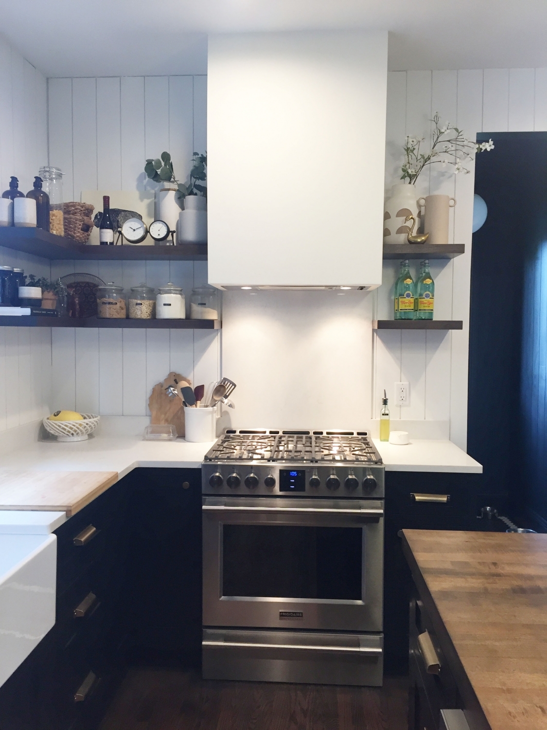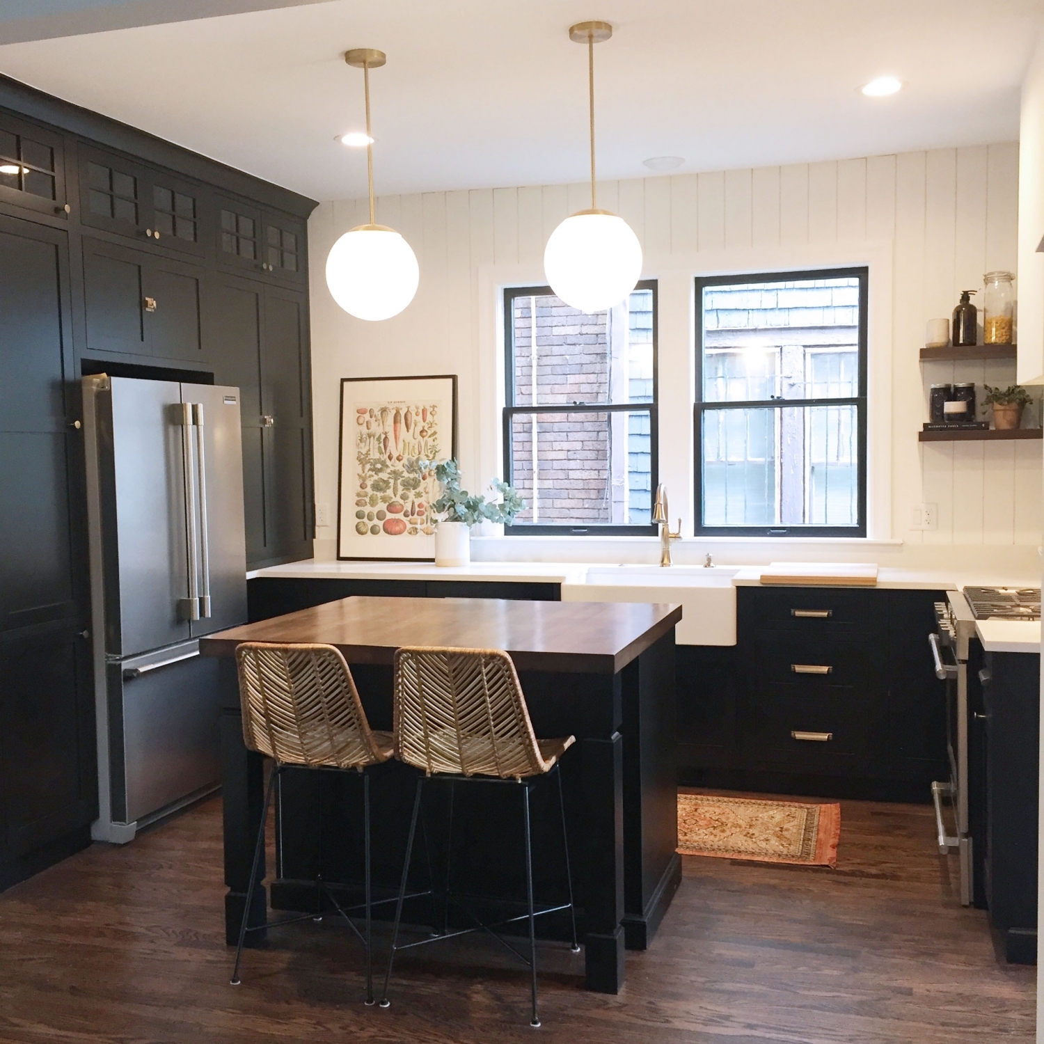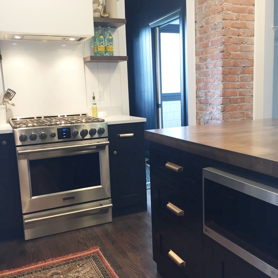 What a transformation! This West Village Detroit Home needed a lot of work but the result is amazing! We are loving the black cabinets with gold hardware, faucet, and light fixtures! The warm wood floating shelving and island top paired with the with grey veining quartz top is a great mix of wood and stone adding natural elements to give the kitchen a cozy vibe. The white shiplap and apron front sink, bring in the popular farmhouse trend. I guess we would call this a mid-century modern farmhouse!